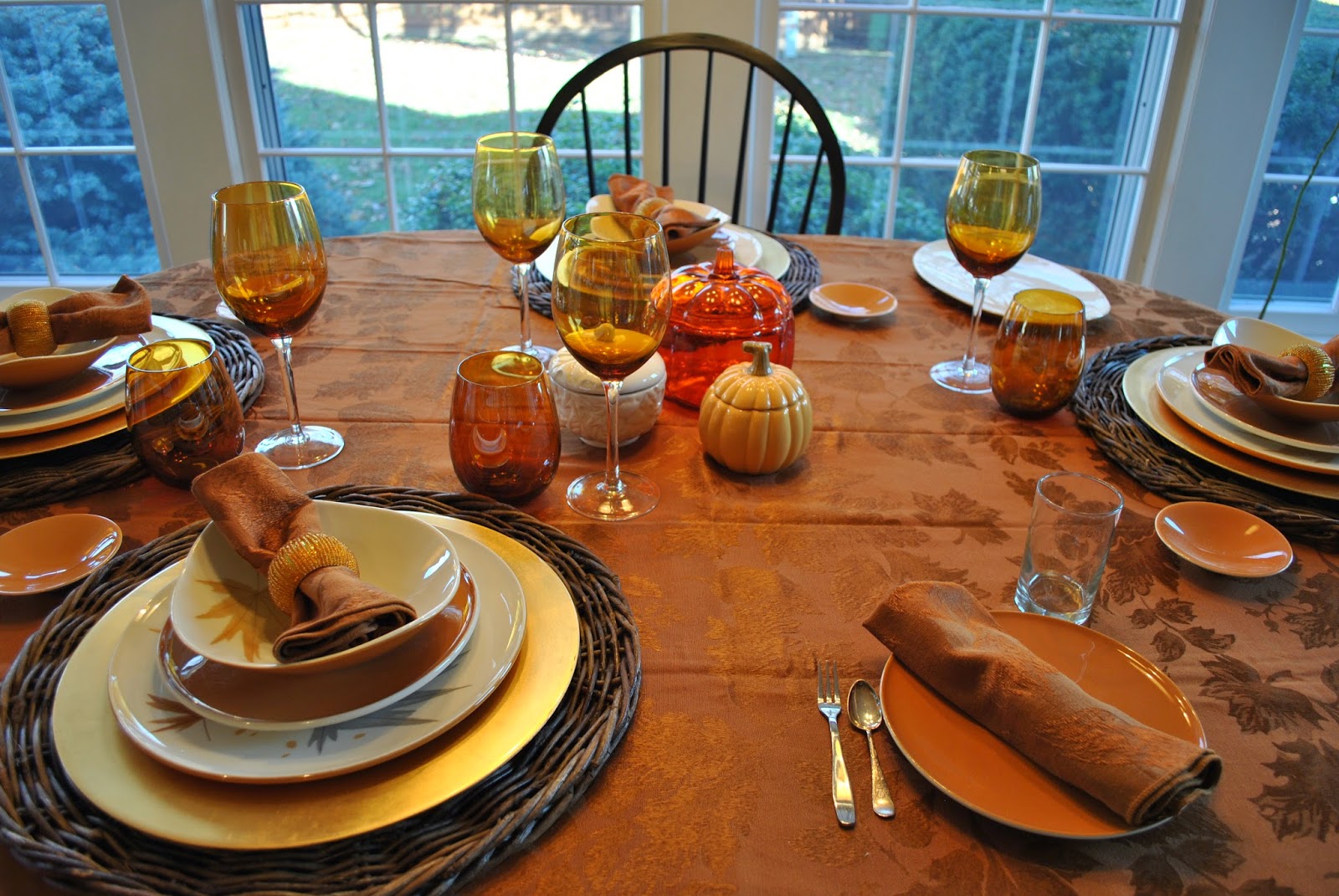 I've added in a couple of different charges, one in a grapevine wreath design and the other in gold. I found the wine glasses and water goblets at Pier 1 last year. I love the rich amber color.